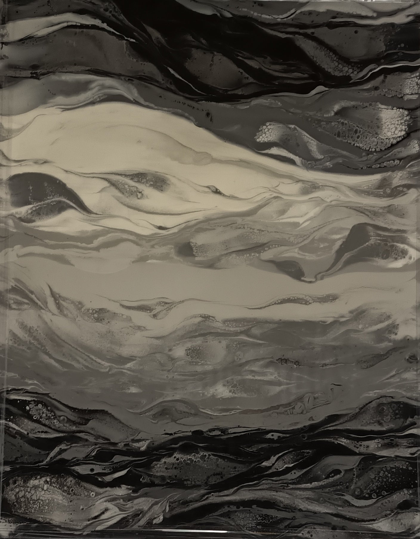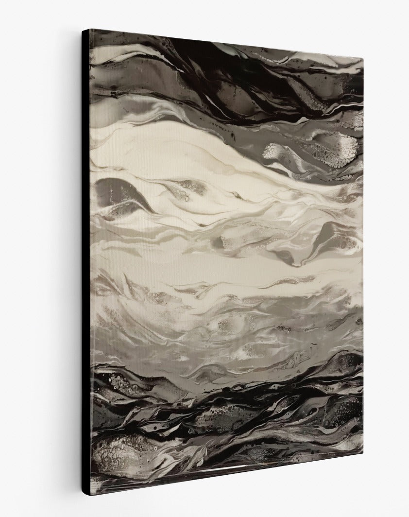 Original en Resina de la Artista Hanna Tsybulskaya realizada sobre estructura de madera, destacando su brillo y los diferentes tonos de negro, grises y blanco.