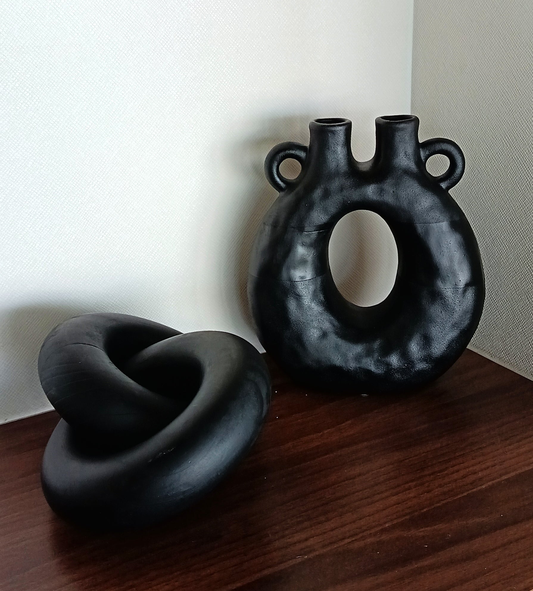 Vasija de cerámica color negra en 2 texturas, de 16 x 19 cm